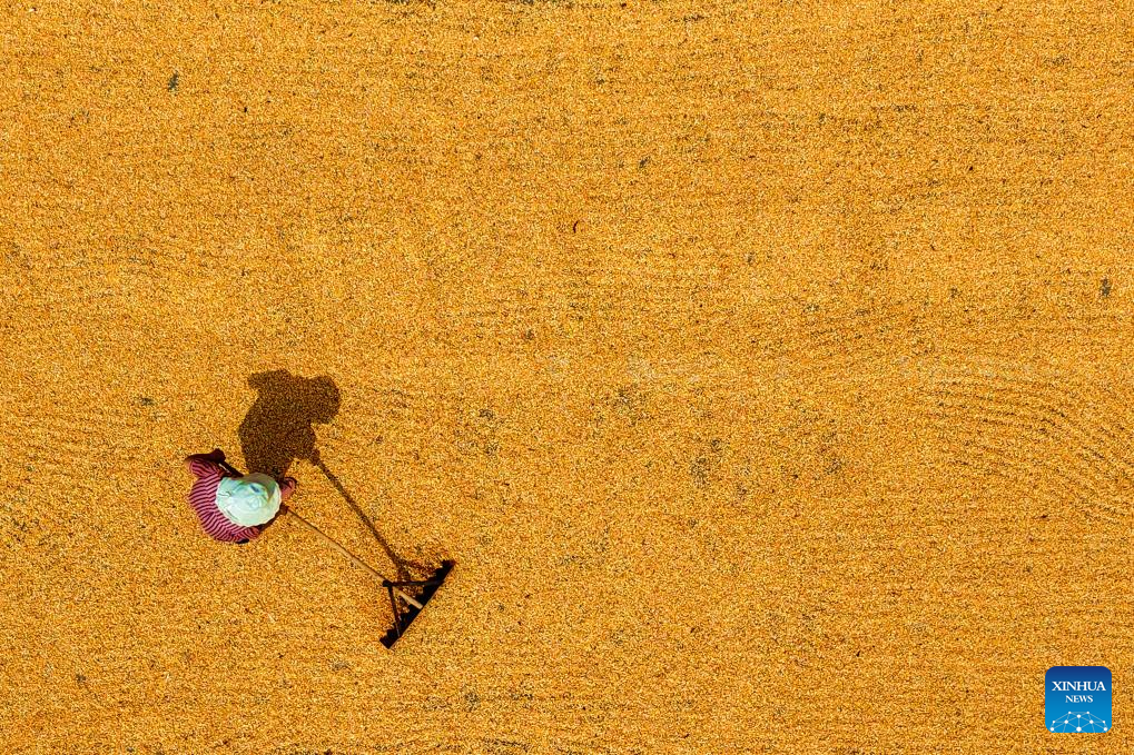 BEIJING, 11 septiembre, 2025 (Xinhua) -- Vista aérea tomada con un dron el 9 de septiembre de 2025 de un aldeano aireando maíces, en el poblado de Baotai, en el distrito de Pingyi, en la ciudad de Linyi, en la provincia de Shandong, en el este de China. (Xinhua/Wu Jiquan)