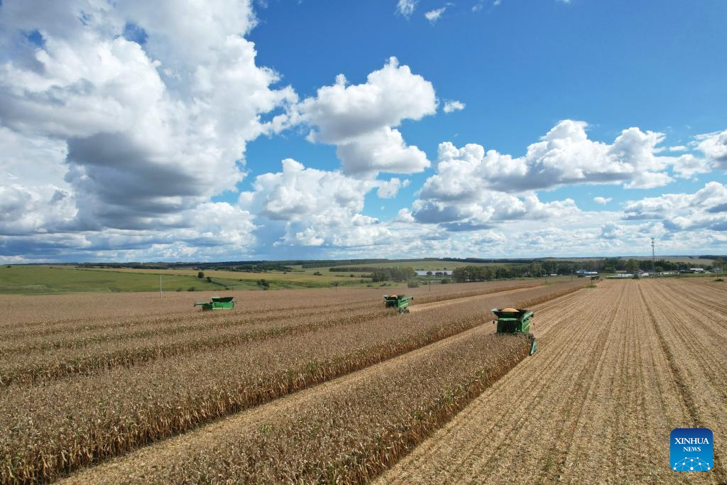 BEIJING, 11 septiembre, 2025 (Xinhua) -- Imagen tomada con un dron el 10 de septiembre de 2025 de cosechadoras trabajando en una granja bajo el Grupo Beidahuang, en la provincia de Heilongjiang, en el noreste de China. (Xinhua/Xu Yingxian)