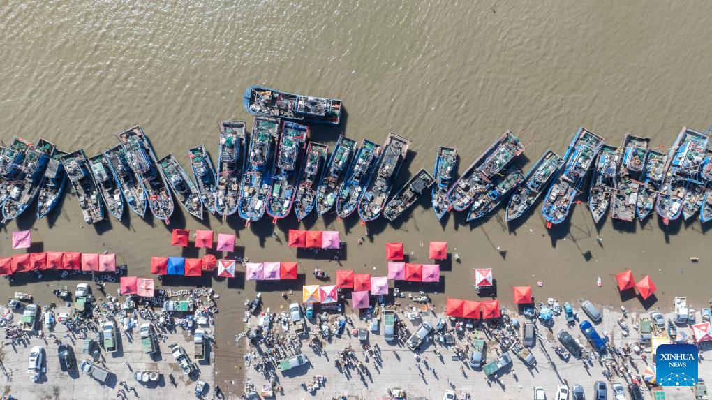 BEIJING, 11 septiembre, 2025 (Xinhua) -- Vista aérea tomada con un dron del 8 de septiembre de 2025 de barcos pesqueros en un puerto, en distrito de Fengnan de Tangshan, en la provincia de Hebei, en el norte de China. (Xinhua/Li Xiuqing)