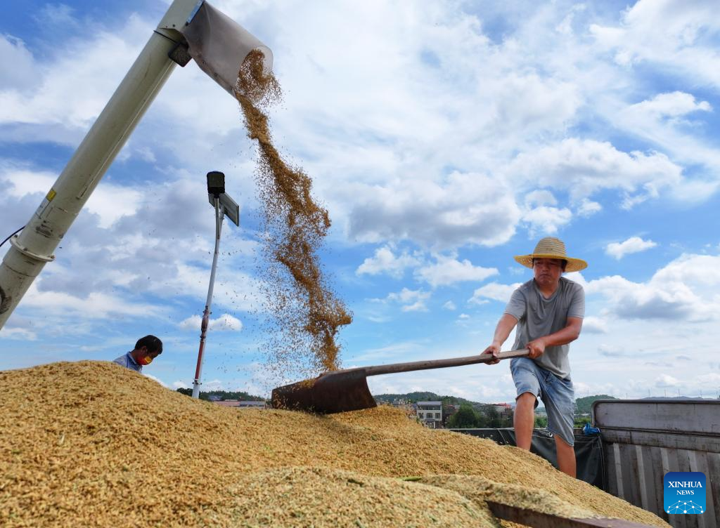 BEIJING, 11 septiembre, 2025 (Xinhua) -- Imagen tomada con un dron de agricultores cosechando arroz, en el municipio de Shitan del distrito de Hengdong, en la ciudad de Hengyang, en la provincia de Hunan, en el centro de China, el 11 de septiembre de 2025. (Xinhua/Cao Zhengping)