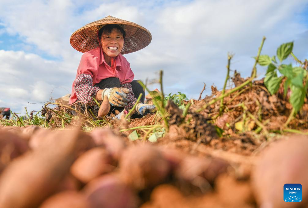 BEIJING, 11 septiembre, 2025 (Xinhua) -- Una aldeana cosecha camotes, en el poblado de Xianglinpu del distrito de Daoxian, en la ciudad de Yongzhou, en la provincia de Hunan, en el centro de China, el 11 de septiembre de 2025. (Xinhua/Jiang Keqing)