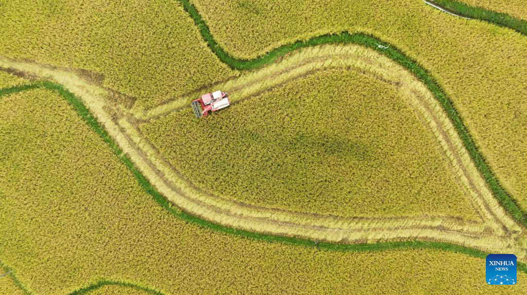 BEIJING, 11 septiembre, 2025 (Xinhua) -- Vista aérea tomada con un dron de una cosechadora trabajando en un campo, en el poblado de Wangcao del distrito de Suiyang, en la provincia de Guizhou, en el suroeste de China, el 11 de septiembre de 2025. (Xinhua/Li Qianyong)
