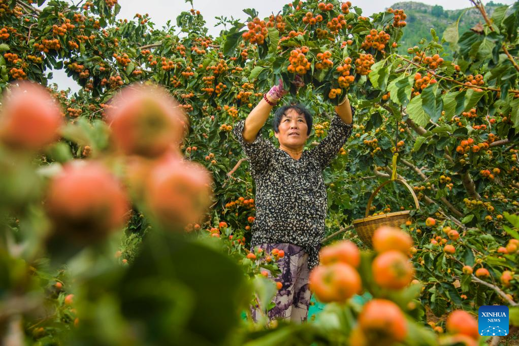 BEIJING, 11 septiembre, 2025 (Xinhua) -- Una aldeana recoge espinos, en el poblado de Shuiquan del distrito de Shanting, en la ciudad de Zaozhuang, en la provincia de Shandong, en el este de China, el 11 de septiembre de 2025. (Xinhua/Liu Mingxiang)