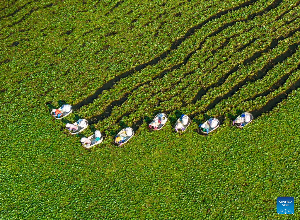BEIJING, 11 septiembre, 2025 (Xinhua) -- Vista aérea tomada con un dron el 10 de septiembre de 2025 de aldeanos recogiendo castañas de agua, en el poblado de Suchen del distrito de Hailing, en la ciudad de Taizhou, en la provincia de Jiangsu, en el este de China. (Xinhua/Zhou Shegen)