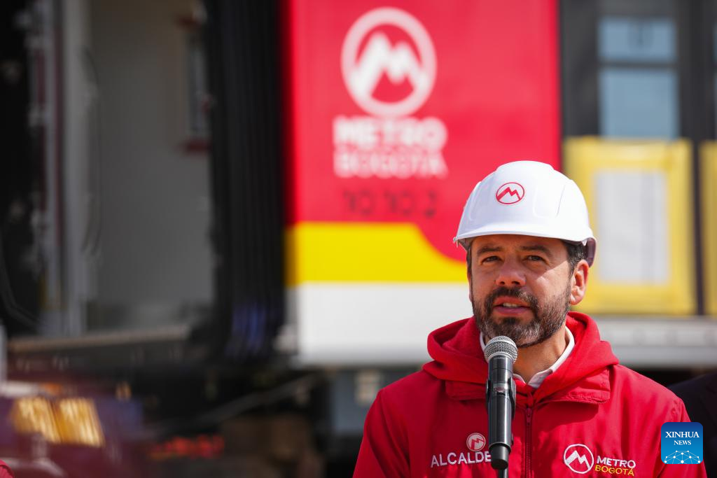 El alcalde de Bogotá, Carlos Fernando Galán, habla durante la llegada del primer tren de la Línea 1 del Metro de Bogotá al patio-taller, en el sur de Bogotá, capital de Colombia, el 11 de septiembre de 2025. Durante la madrugada del jueves llegó a Bogotá el primer tren de la Línea 1 del Metro de la capital colombiana, cuya construcción está a cargo del consorcio conformado por las empresas chinas China Harbour Engineering Company Limited y Xi'an Metro Company Limited, obra que tiene un avance del 62,16 por ciento, de acuerdo con información de la alcaldía. (Xinhua/Andrés Moreno)
