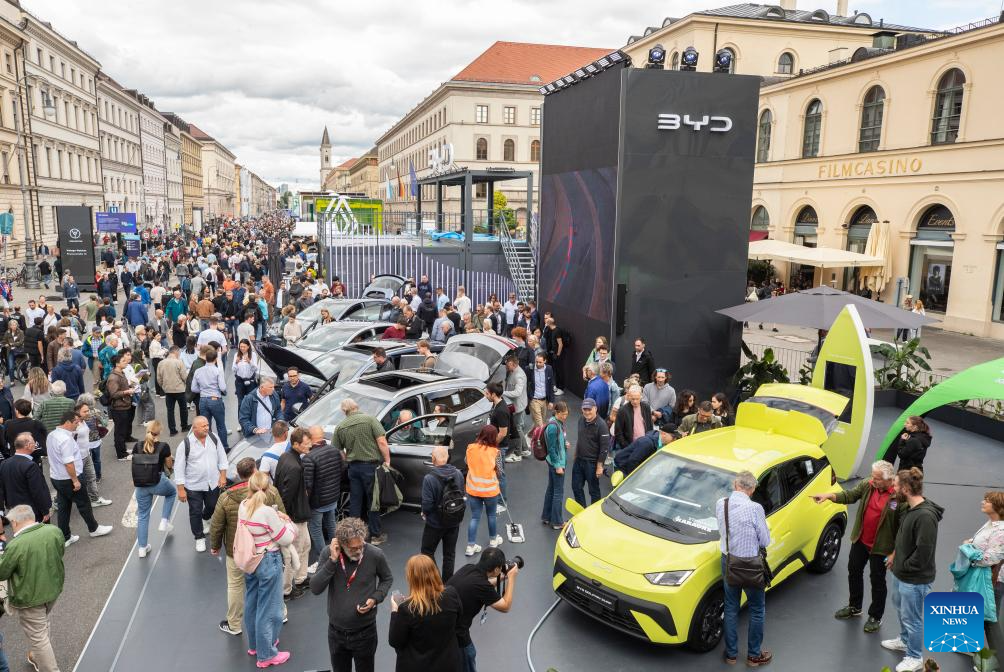MUNICH, 11 septiembre, 2025 (Xinhua) -- Personas visitan la zona de exposición de BYD en el Espacio Abierto de la IAA Mobility 2025, en Múnich, Alemania, el 11 de septiembre de 2025. La IAA Mobility 2025, una de las ferias de movilidad más grandes del mundo, comenzó aquí el martes, con fabricantes y proveedores de automóviles globales mostrando vehículos eléctricos, conducción autónoma e innovaciones impulsadas por software. (Xinhua/Zhang Fan)