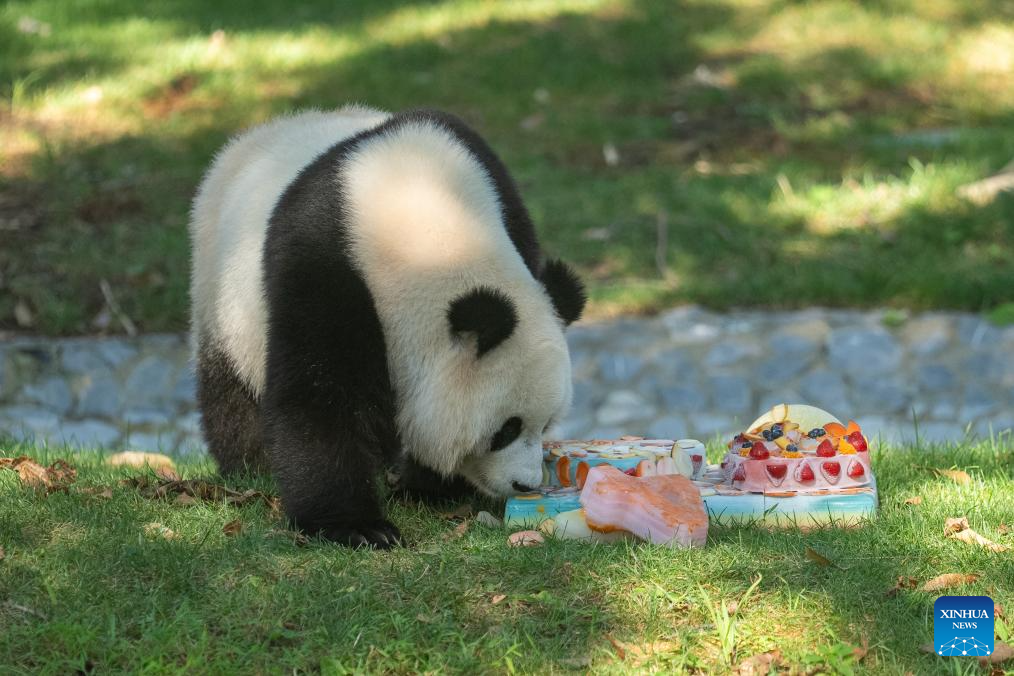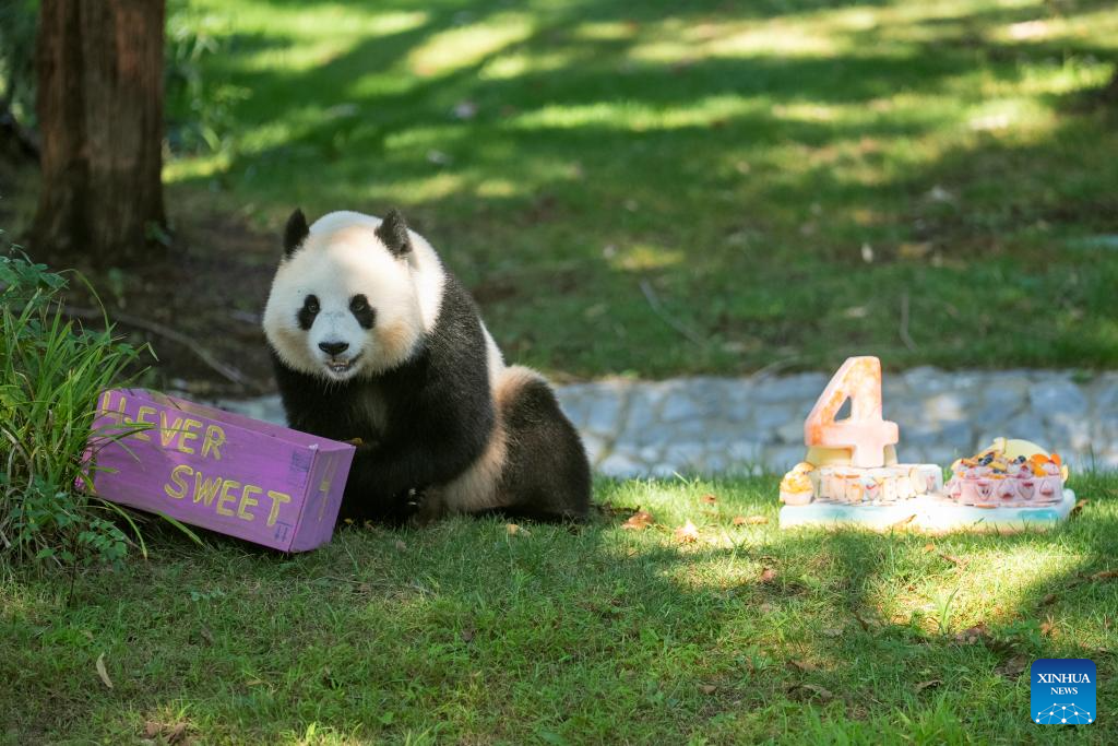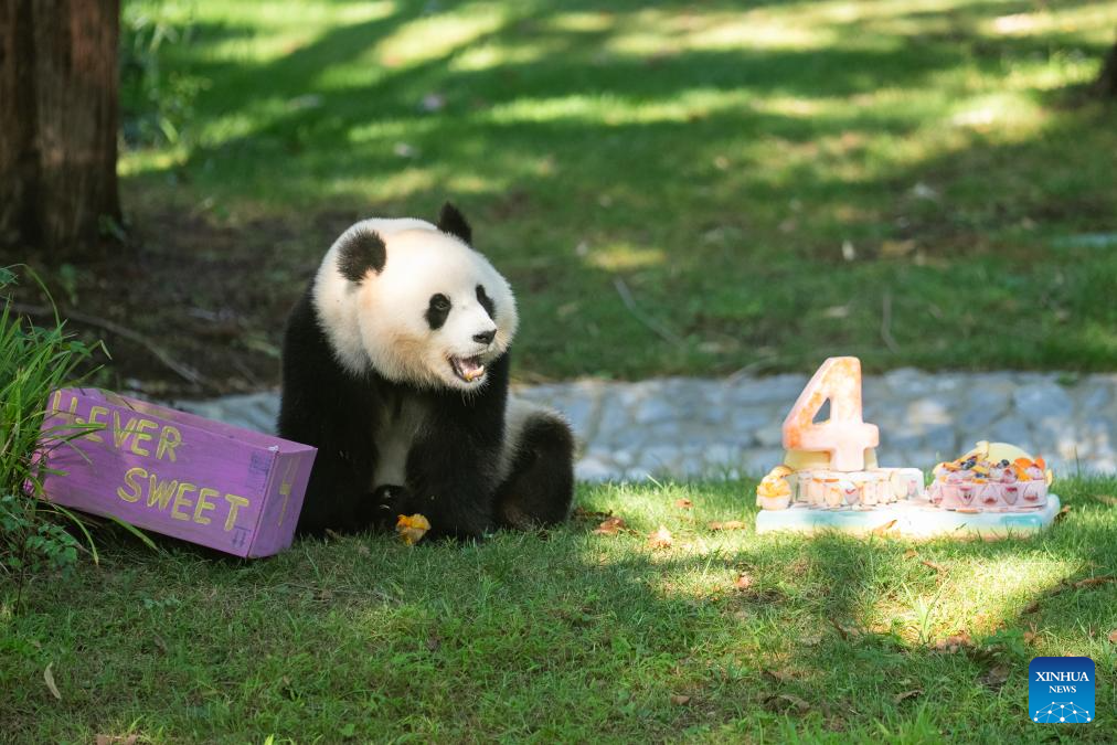 WASHINGTON, 12 septiembre, 2025 (Xinhua) -- La panda gigante Qing Bao come el pastel de cumpleaños durante la celebración de su cuarto cumpleaños en el Zoológico Nacional Smithsonian, en Washington D.C., Estados Unidos, el 12 de septiembre de 2025. (Xinhua/Hu Yousong)