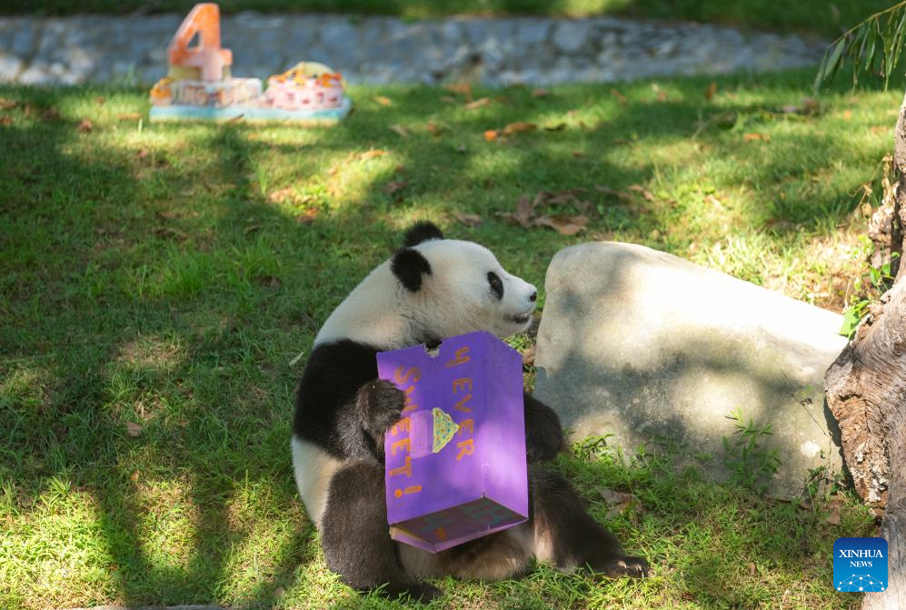WASHINGTON, 12 septiembre, 2025 (Xinhua) -- La panda gigante Qing Bao juega con regalos de cumpleaños durante la celebración de su cuarto cumpleaños en el Zoológico Nacional Smithsonian, en Washington D.C., Estados Unidos, el 12 de septiembre de 2025. (Xinhua/Hu Yousong)